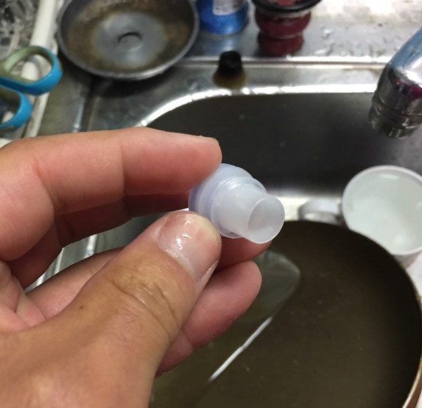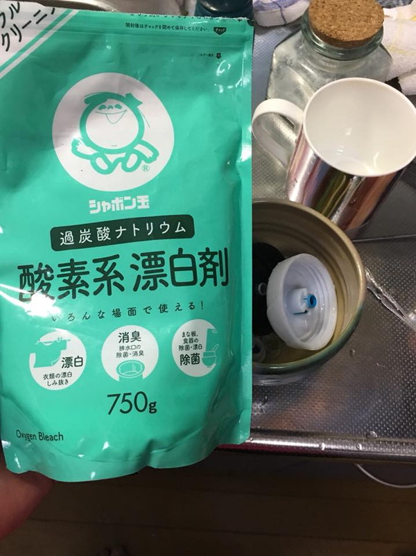 ここがちょっととりにくいのですがぐいぐいしてがんばって取りましょう。破損させないように気を付けてくださいね。そしてここのシリコンのオーリングは絶対に紛失しないように!!全部分解したらボトルキャップのパーツを陶器などの容器にいれて漂白します、前のウェアの漂白の記事でもかきましたが使うのは、酸素系漂白剤です、塩素系ではりません。塩素をこんな手が届かない部分に残留させるのはカビと同じくらい気になりますよね。