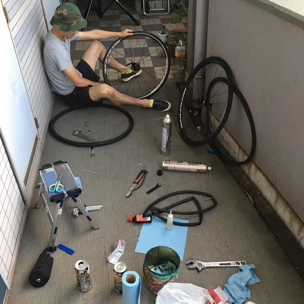 せっかく晴れているけど猛暑すぎて走れない!そうだ、家の掃除のついでに自転車のメンテナンスをしよう。ということで旅谷くんの愛車 キャノンデールのCAAD12を二人できれいにすることにしました。