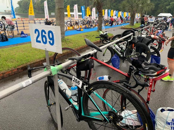 コースを周回するときに一度砂浜にあがるのでそこで改めてしっかりかぶり直した!給水して今一度何も見えない水に入っていく、2週目は脱げることもなくロープにつかまる事もなく普通にちゃんと泳げた。よかった・・・。37分くらいで海からでてトラジションエリアへ、バイク用のシューズをはいて得意のバイクパートへ、ここは調子よかった、ここだけ俺の日かとおもった笑